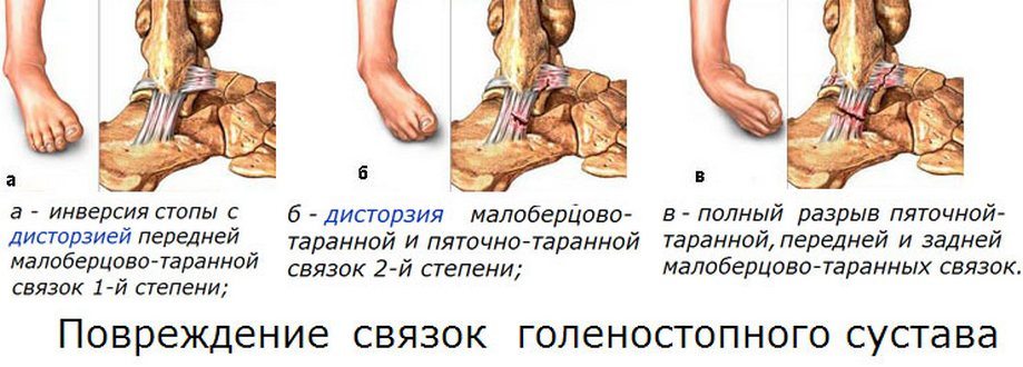 | Третья | Все волокна связки разрываются. Травмирование сопровождается острыми болями, выраженными отеками и кровоизлияниями, резким ограничением подвижности, невозможностью упора на стопу |