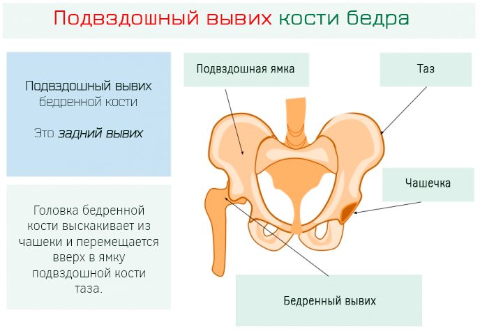 | Подвздошный | Бедренная кость располагается позади подвздошной. Нога согнута и развернута вовнутрь. В области ягодицы имеется выступ, в паху – западение. При осмотре обращает на себя внимание укорочение ноги | Внезапное сгибание или вращение ноги, согнутой в коленном и тазобедренном суставе, что обычно случается при ДТП |
