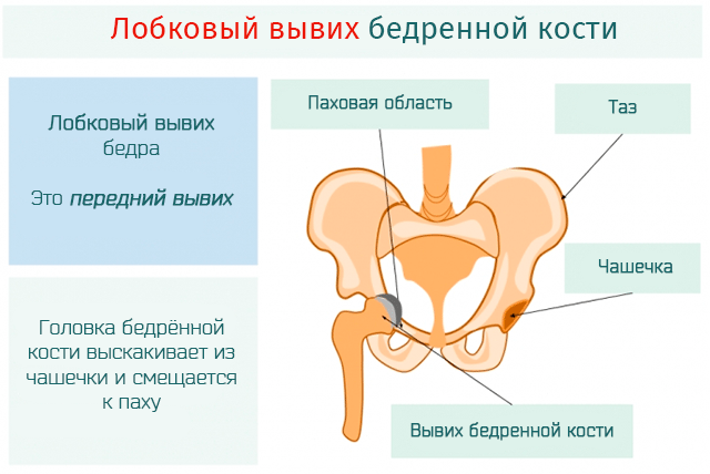 | Надлонный | Головка бедра располагается спереди от подвздошной кости. Нога больного разогнута и развернута наружу. В области паха виднеется выпуклое образование, а ягодица со стороны поврежденной конечности выглядит уплощённой | Резкое падение с высоты на отведенную, согнутую и развернутую наружу ногу |
