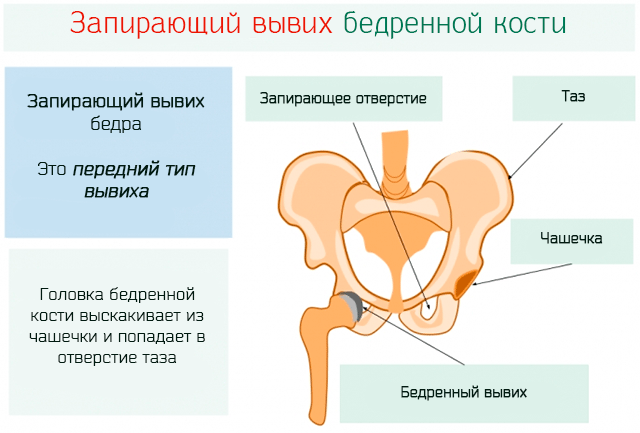 | Запирательный | Головка бедренной кости находится рядом с лобковой. Нижняя конечность сильно развернута наружу, согнута в коленном и тазобедренном суставах | Аналогичен предыдущему |