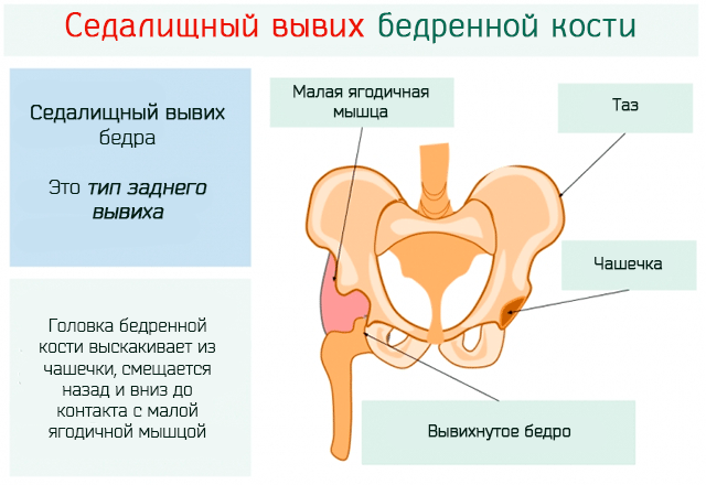 | Седалищный | Головка бедра находится поблизости от седалищной кости. Деформация выражена в большей степени, чем при подвздошном вывихе | Аналогичен предыдущему |