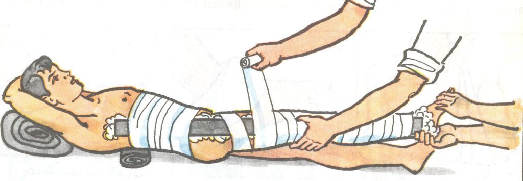 Прибывшие медработники вводят больному обезболивающие средства и выполняют транспортную иммобилизацию пострадавшей конечности. Ногу всегда фиксируют в том положении, в котором она находится. После этого человека как можно быстрее доставляют в травматологическое отделение.